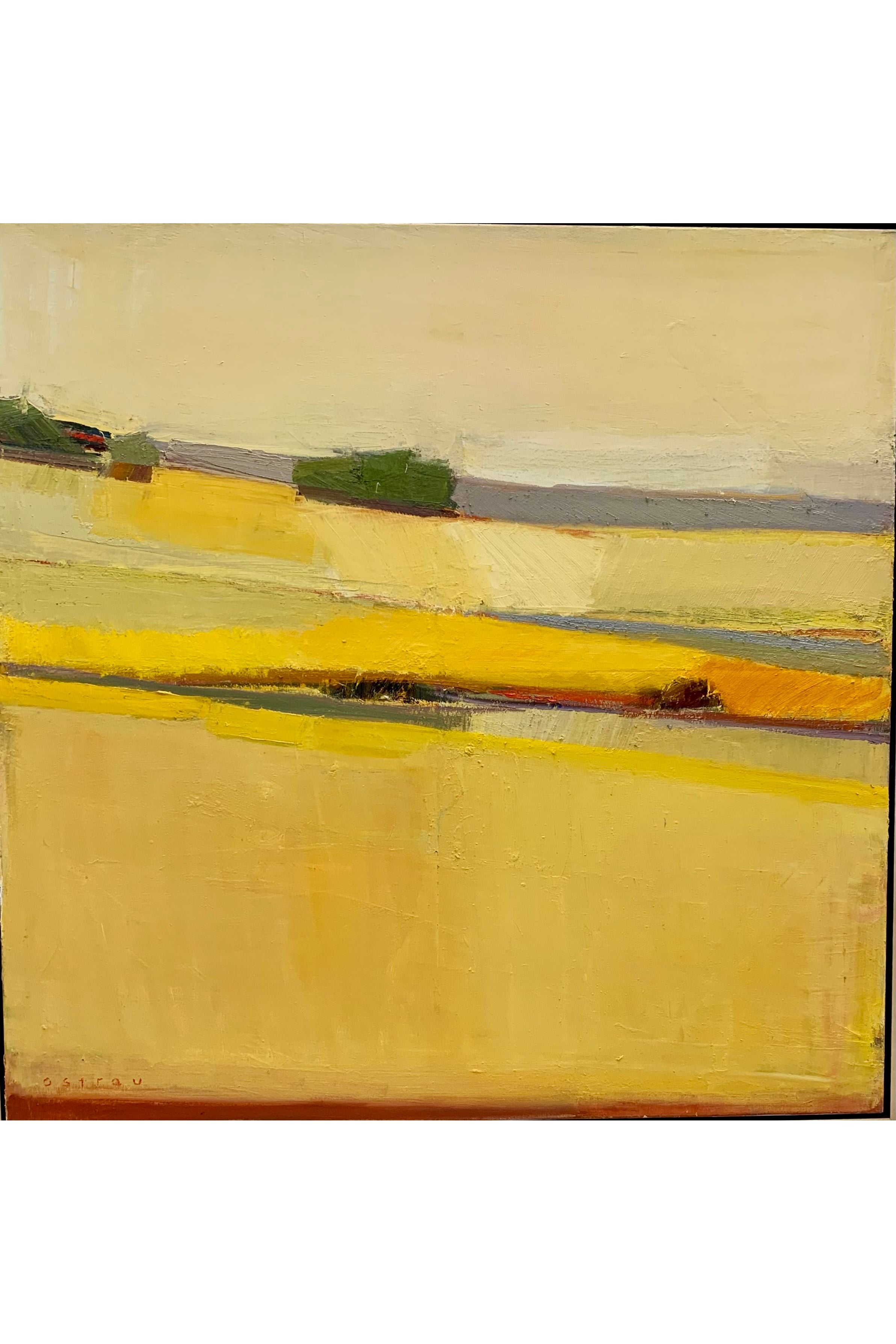 Height 48 in, width 48 in. Featuring a bold, abstract style in which all elements are distilled down to essential, interlocking forms, Ostraus aesthetic is heavily indebted to Bay Area Figuration, with roots in the en plein air tradition of nineteenth-century French Impressionism. Her paintings are consequently suffused with atmosphere, movement, and vibrant complementary colors.
