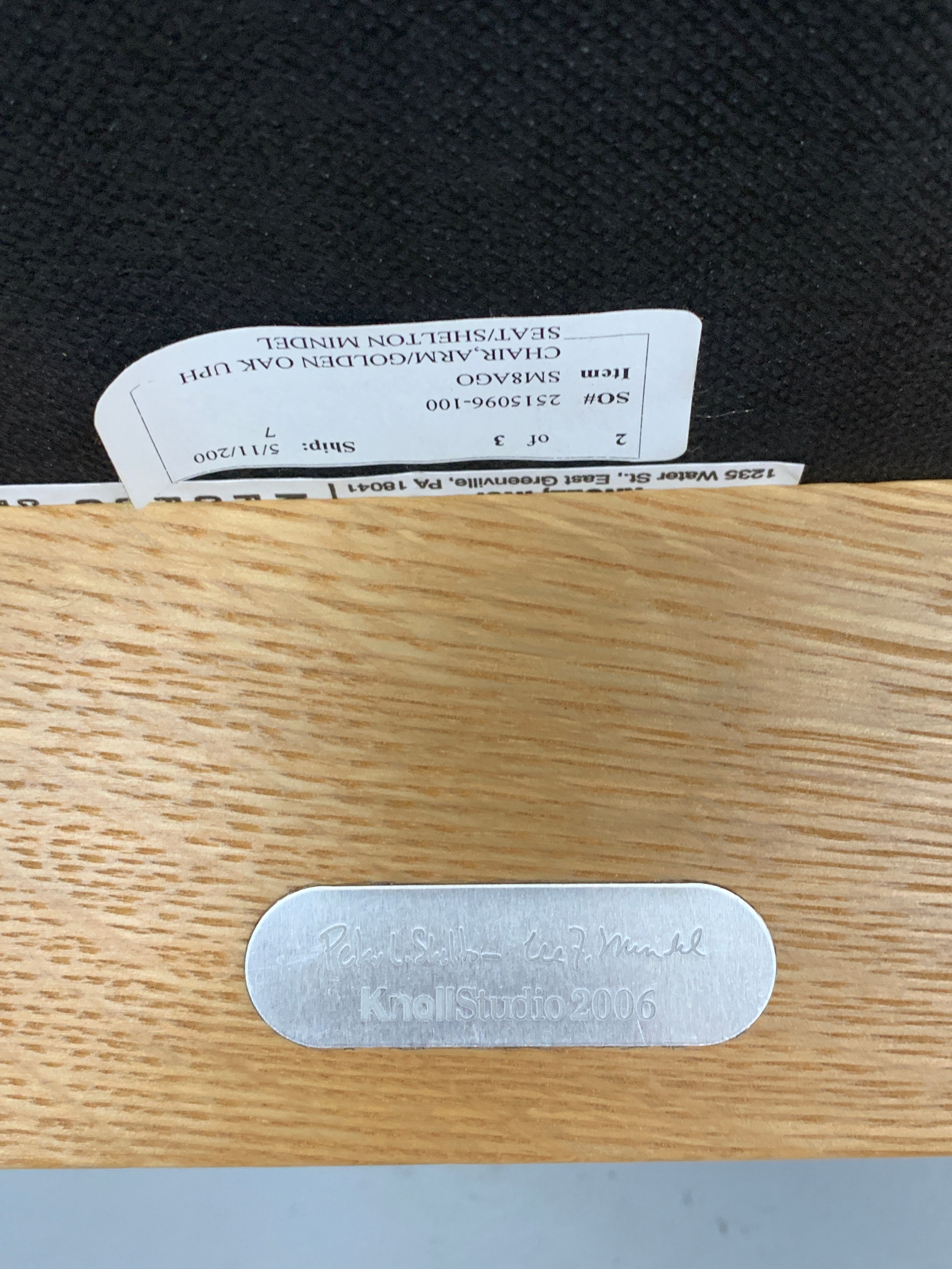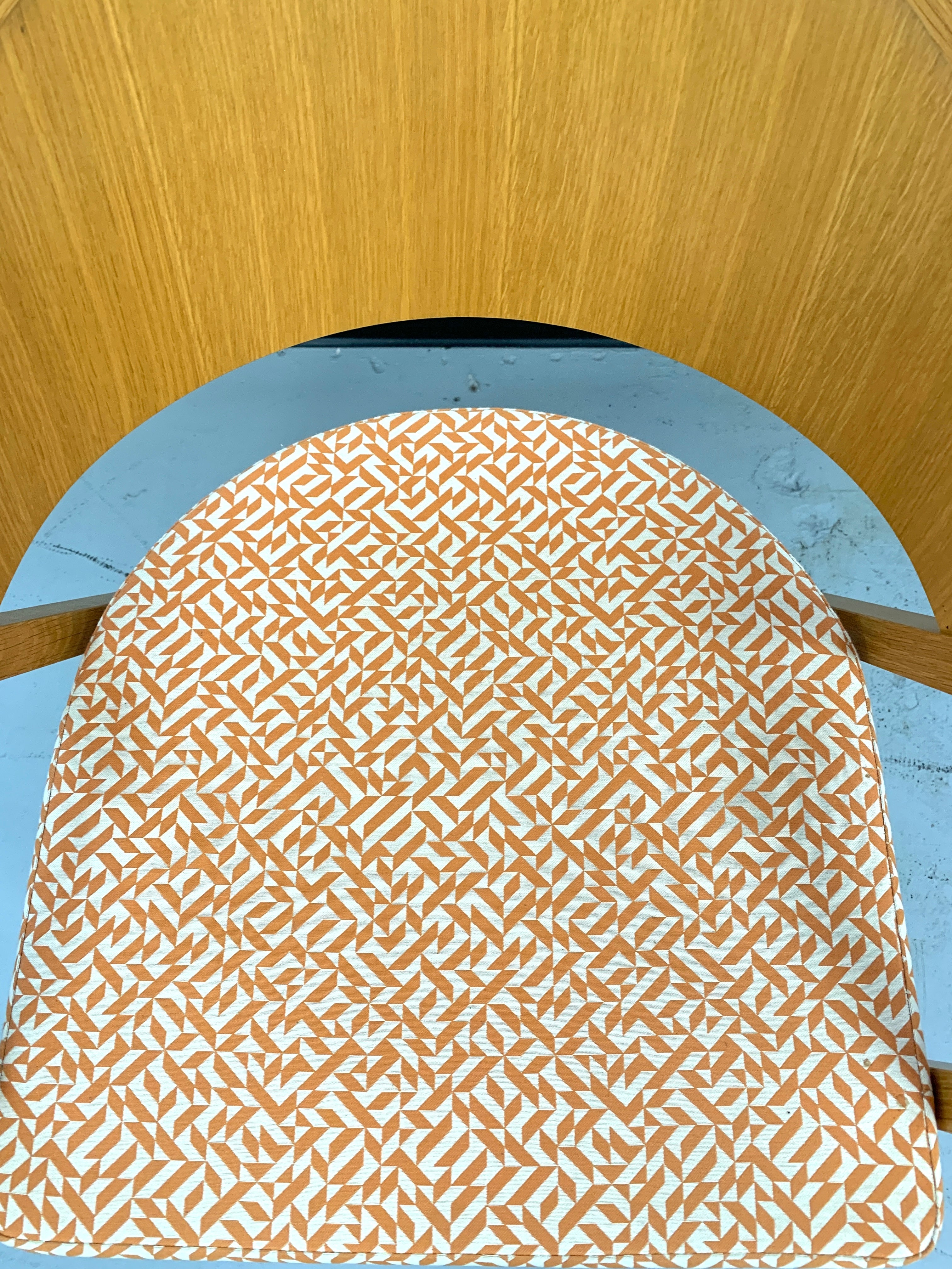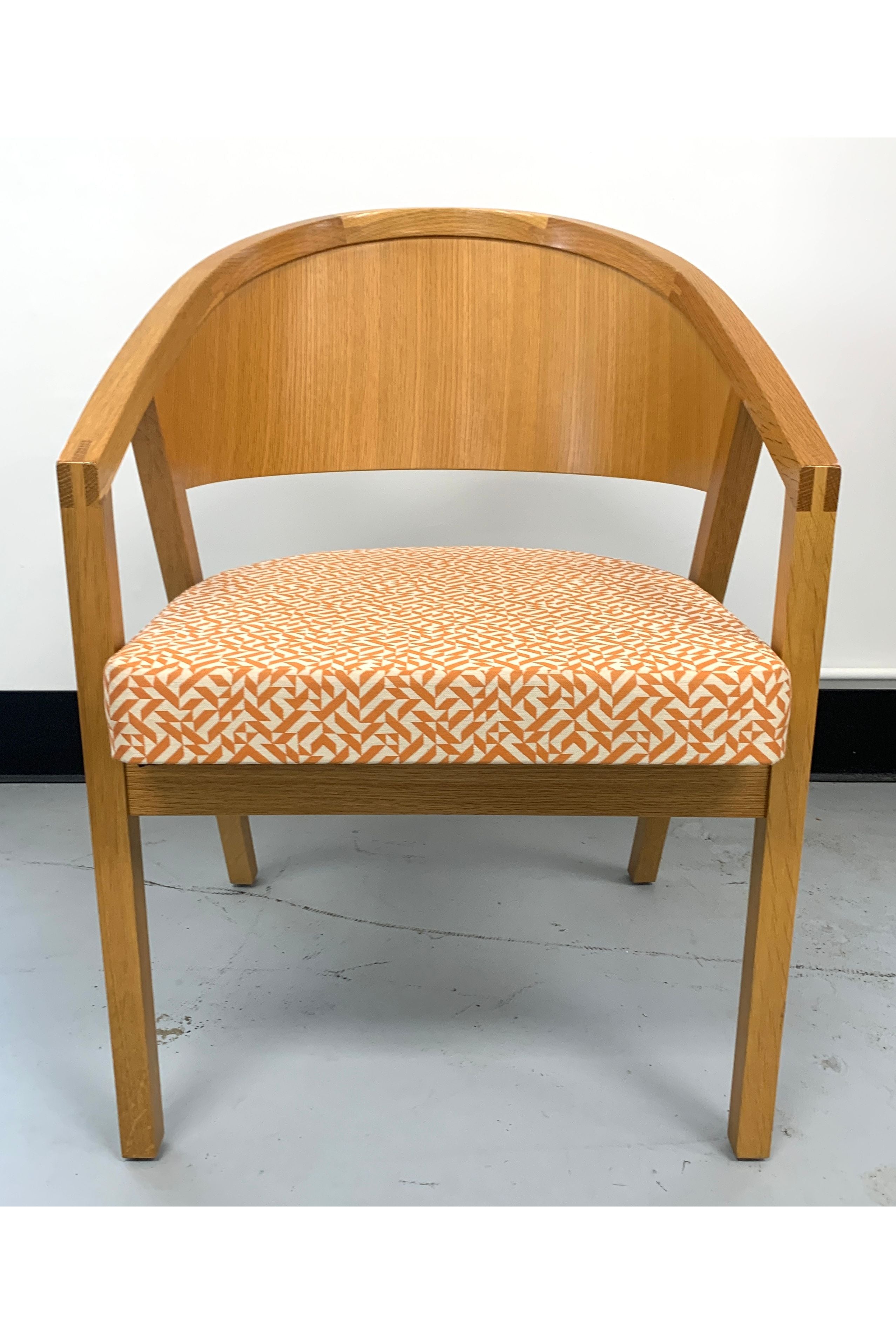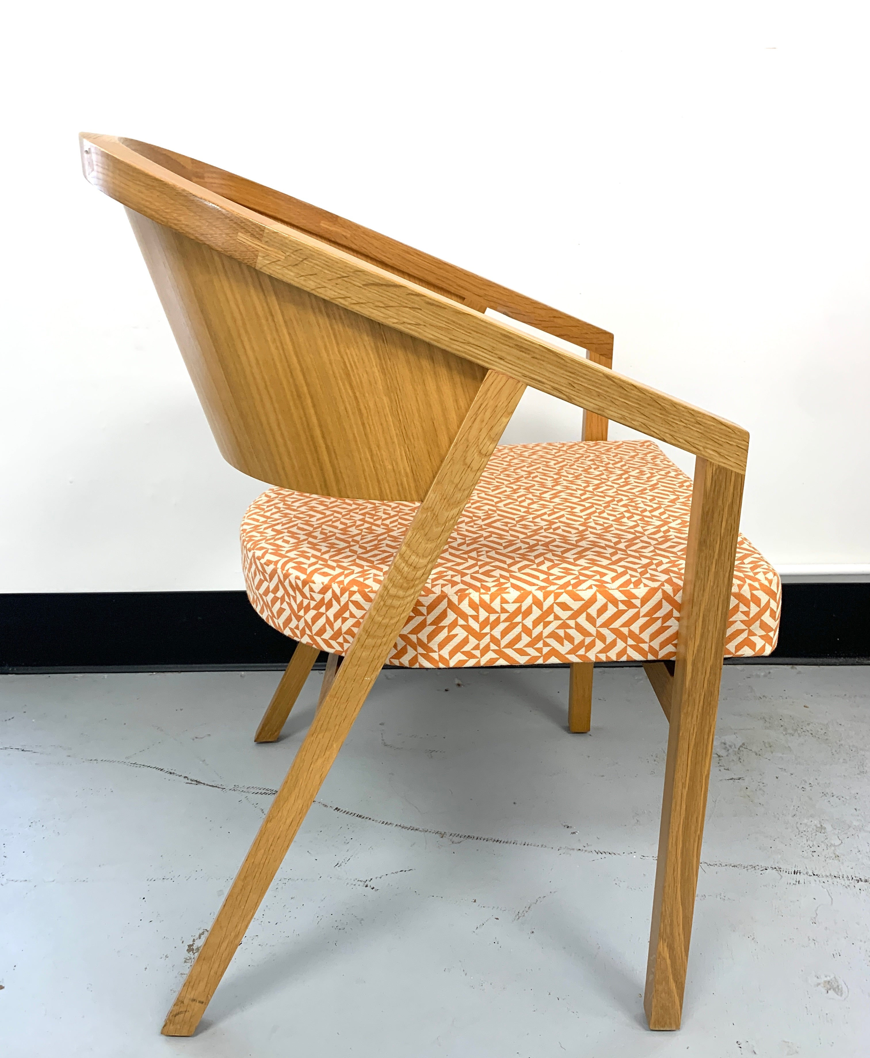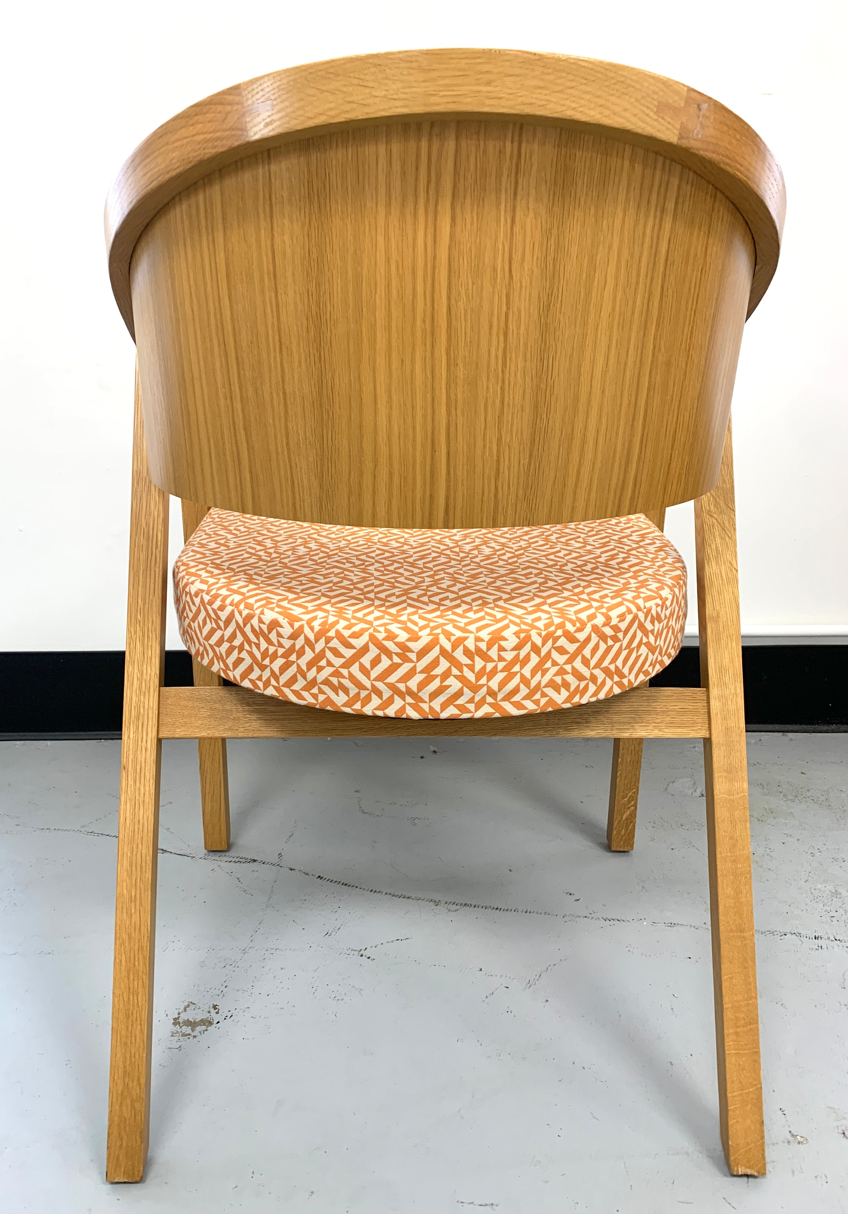 width 22 in; depth 23 in; height 32 in. Classic Knoll side chair manufactured 2000-2009 has lacquered wood and orange and white upholstery.